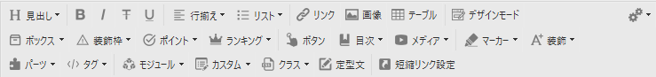 見出し、強調、打消し線、行揃え(中央揃え、右揃え、左揃え)リンク、画像、テーブル、ボックス、ランキング、ボタン、目次、メディア、パーツぐらいは使っています。