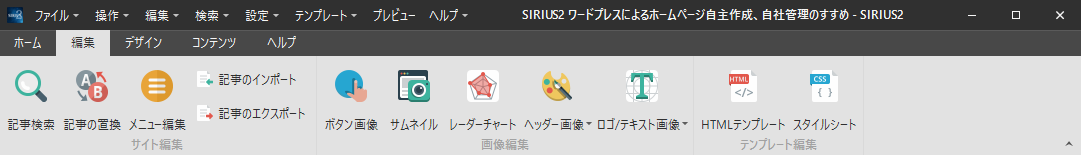 編集では、記事検索、記事の置換、メニュー編集、記事のインポート記事のエクスポート、ボタン画像、サムネイル、レーダーチャート、ヘッダー画像、ロゴ/テキスト画像、HTMLテンプレート、スタイルシートと並んでいます。