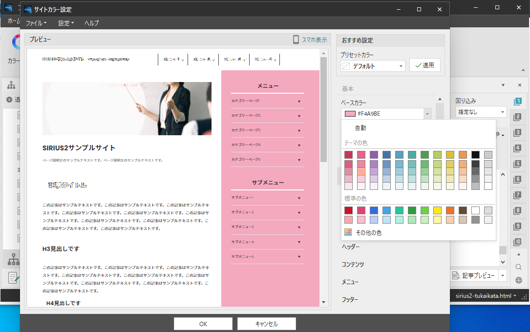 デザインのカラーでサイトの色を変更することが出来ます。