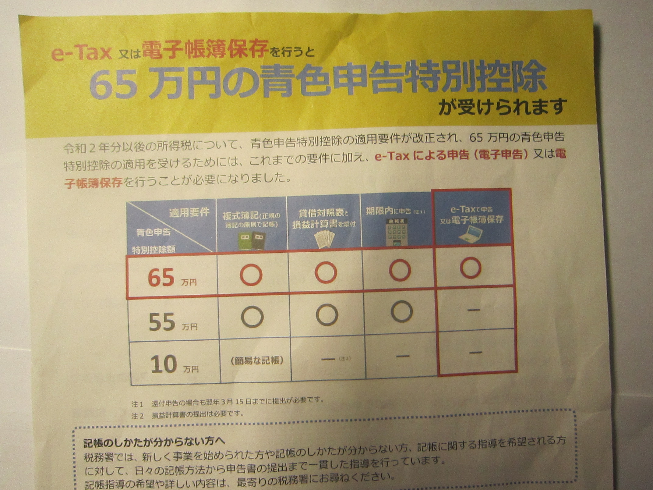 e-taxで、無事に確定申告が済めば65万円の控除になります。